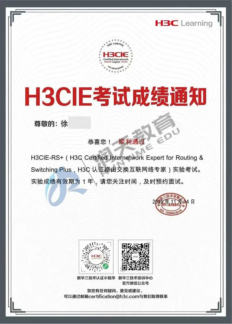 近期,我们陆续收到多位学员通过H3CIE-RS+认证的好消息——笔试稳扎稳打、机试从容应对、面试自信流畅。一张张高含金量的证书背后,不仅是学员日复一日的努力,也离不开我们对H3CIE-RS+全周期教学体系的持续打磨与优化。