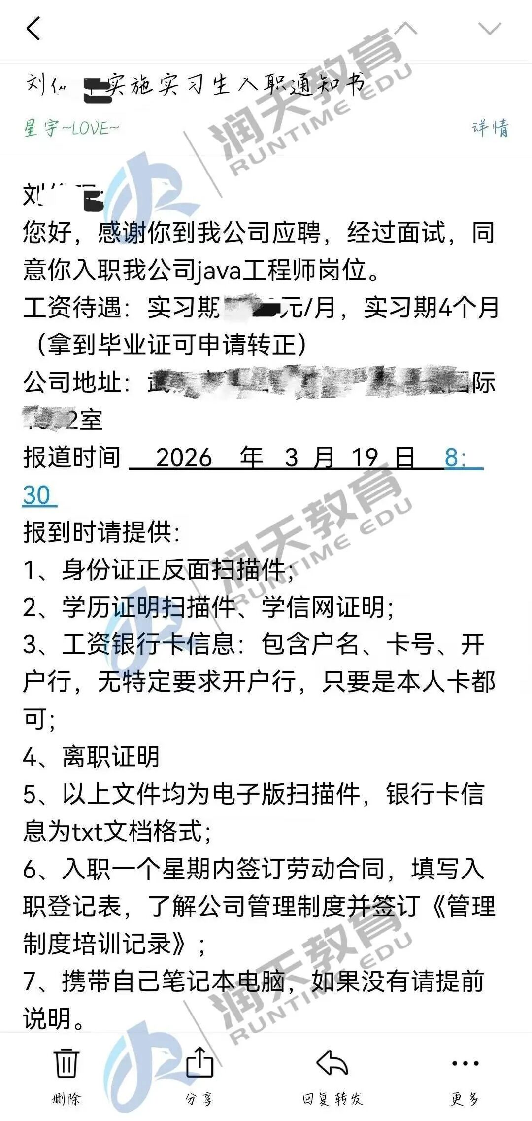 教育的价值,远不止于一份offer。最让我们欣慰的,是在这段奋斗旅程中建立的信任与深厚情谊。正如我们老师与一位刚刚入职的学员的对话那样,学生的成功与感激,是老师们所有辛勤付出最珍贵的回响。这份“亦师亦友”的陪伴与成就彼此的快乐,正是润天教育希望传递的温度。