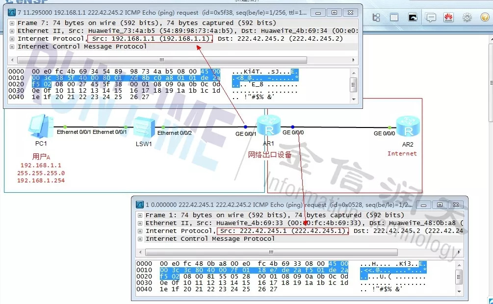 内网用户 A 访问 Internet ,产生数据报文携带的源地址为 192.168.1.1(私网地址),但是该数据到了网络出口设备后,会通过 NAT 技术将报文携带的源地址替换成 222.42.245.1 (公网地址)去请求网络服务。如果用户 A 所做的操作是违规的,此时对于网警来说,如果要定位到用户A ,就只能通过 222.42.245.1 这个地址来进行定位,无法直接定位至用户 A ,因为私网地址是别人看不到的。