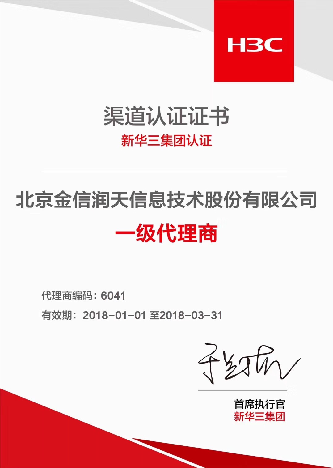 金信润天,新华三集团渠道体系的“四星一代”,四星级服务提供商,一级代理商