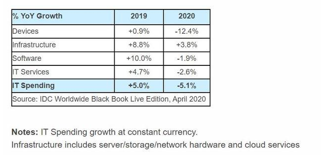 在今年早些时候,IDC曾预测今年的IT支出预计增长5%左右。之后,因为疫情的爆发,IDC预测2020年仅增长1%。