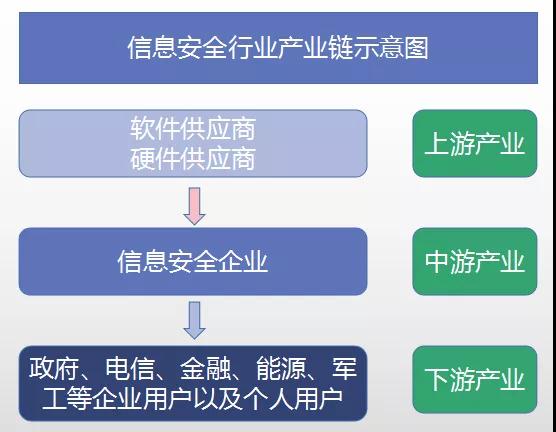 从产业链的角度,信息安全产业链上游为操作系统、数据库、应用APP等软件供应商和服务器、路由器、交换机、防火墙等硬件设备供应商,信息安全产业链的中游为信息安全企业,这些企业主要提供信息安全解决方案及服务下游客户,信息安全产业链下游客户主要为政府、电信、金融、能源、军工等企业级客户和个人用户。