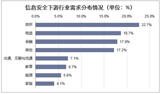 信息安全以政府和大型国企投资为主。目前,中国信息安全产业链中,下游客户主要为政府部门、电信、金融、能源等信息化程度高且对信息较敏感的行业。而在投入来源中,政府领域的信息安全投入占比最大,接近三分之一,其次是电信(18.7%)和金融(17.9%)领域。信息安全以政府和大型国企投资为主,企业投入占比较低,这是因为信息安全的投入对于公司而言并不产生直接经济效益,主要起到防御作用,只有出现网络安全事件的时候才能凸显其价值。