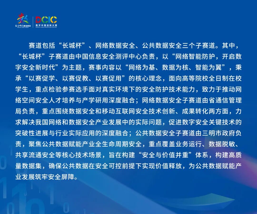 (五)决赛 决赛线下举行,时长3小时。网络安全方向和数据安全方向将同时进行比赛。 1、网络安全方向 网络安全方向设置网络安全理论题和网络安全实操题。 理论试题包括单选、多选和判断题,采用“千人千卷”模式随机组卷分发至选手。理论题考察点包含网络安全相关法律法规、政策、标准以及网络安全策略、风险评估等知识点。 网络安全实操题采用夺旗解题赛模式,知识点包括WEB安全分析与加固、密码算法分析、网络安全应急响应、二进制漏洞挖掘、恶意代码逆向分析。 2、数据安全方向 数据安全方向设置数据安全理论题和数据安全综合场景题。 理论题包括单选、多选和判断题,根据选手ID从系统题库中随机生成。考察知识点主要包括数据安全相关政策、法规、标准以及技术知识点。 数据安全综合场景题通过虚拟仿真企事业单位真实网络环境、重要数据业务系统、人工智能模型的全流程业务场景及面临的典型数据安全攻击事件,考察选手对于企事业单位综合业务场景下的数据安全应用防护与研判分析能力、人工智能模型应用与数据安全分析能力。考察知识点主要包括数据采集安全、数据传输安全、数据存储安全、数据处理安全、数据交换安全、数据销毁安全、数据溯源与处置、逆向分析、人工智能模型数据安全与应用等。