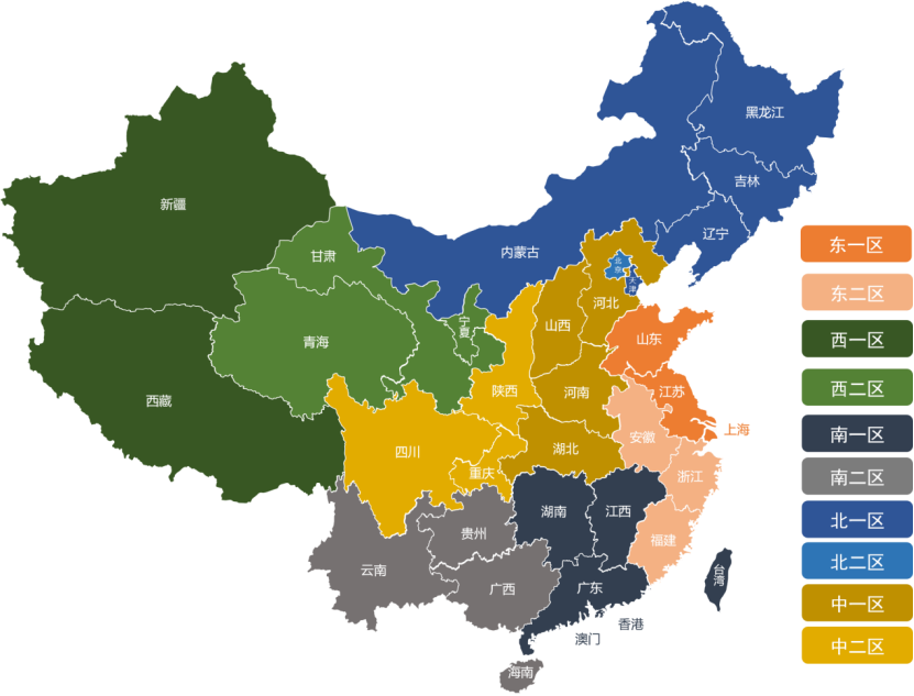 (二)赛区划分 根据参赛队伍代表单位、学校所在地分为东一区、东二区、西一区、西二区、南一区、南二区、北一区、北二区、中一区和中二区十个赛区。预赛,各赛区将同时进行线上比赛,分别排名决定晋级决赛选手。 东一区:山东省、江苏省、上海市 东二区:浙江省、安徽省、福建省 西一区:新疆维吾尔自治区、西藏自治区 西二区:甘肃省、宁夏回族自治区、青海省 南一区:江西省、广东省、湖南省、香港特别行政区、澳门特别行政区、台湾省 南二区:贵州省、云南省、广西壮族自治区、海南省 北一区:辽宁省、黑龙江省、吉林省、天津市、内蒙古自治区 北二区:北京市 中一区:山西省、河南省、湖北省、河北省 中二区:陕西省、四川省、重庆市